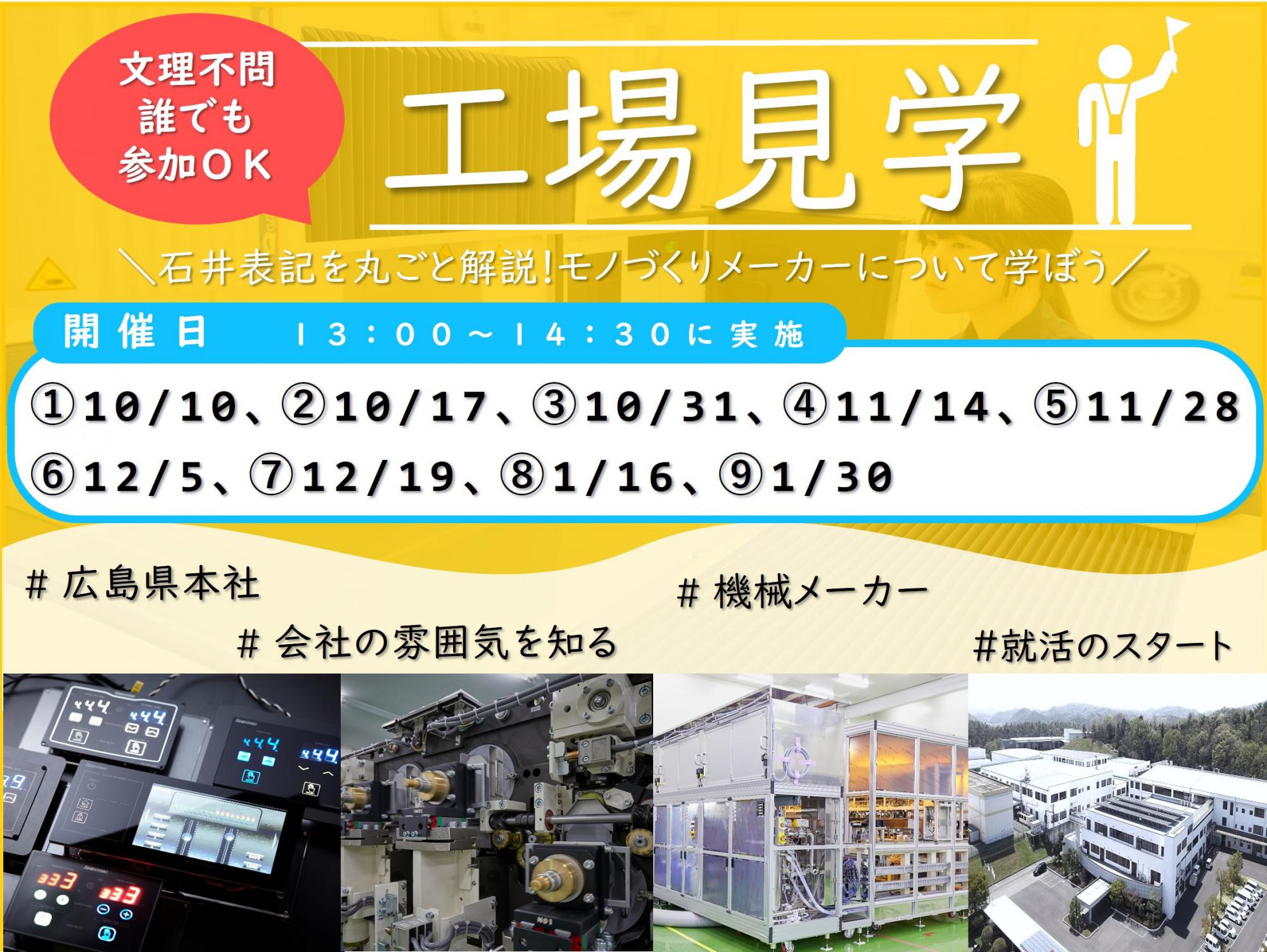 お知らせカテゴリー すべて お知らせ イベント 採用情報 IR情報 2025年9月29日 採用情報 2027年卒対象の工場見学会実施について 2027年卒の学生を対象とした工場見学会を10月~1月の金曜日に実施いたします。 業界研究や企業研究がしたいという学生に向けて、本社工場の見学を通じ石井表記のモノづくりについて理解を深めていただきたいと考えております。普段は目にすることのないモノづくりをしている現場や、事務所などを見学しながら会社の雰囲気や、モノづくりのおもしろさをぜひ体感してみてください。 ご応募お待ちしております! リクナビより予約受付中 →