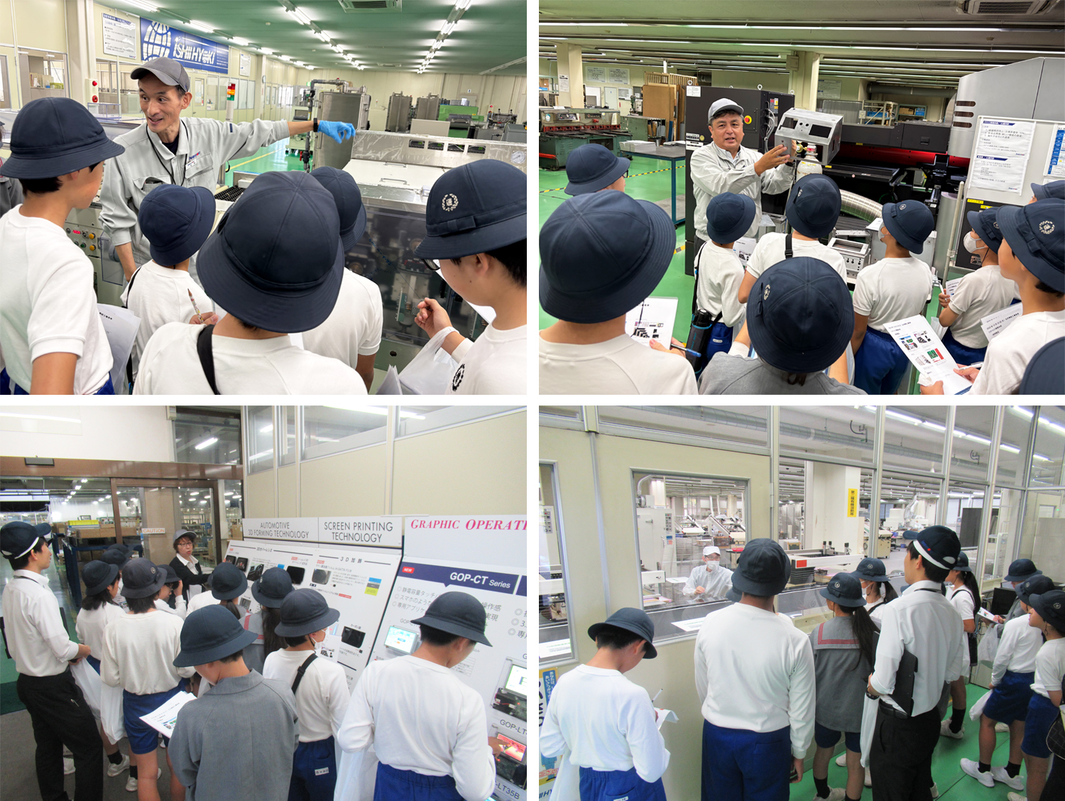 シルクスクリーン印刷エリアでは、樹徳小学校の校舎を写した版を使って印刷の仕組みを学んだり、装置エリアでは、担当者の説明を聞きながらテスト機を動かす体験をしてもらいました。