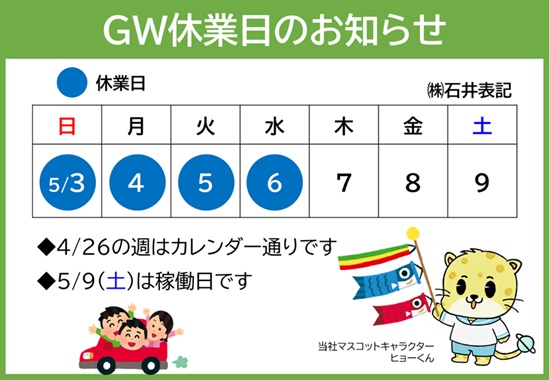 2026年4月21日 お知らせ ゴールデンウィーク休業日のお知らせ Tweet 当社のゴールデンウィーク休業日についてお知らせいたします。 休業中にいただきましたお問い合わせにつきましては、5月7日(木)以降に順次対応いたします。ご了承くださいますようお願い申し上げます。また、オンラインショップでのご注文はインターネットにて受け付けておりますが、商品発送やお問い合わせ等への対応につきましても同様となります。