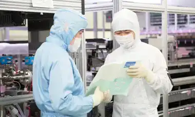 装置の設置にともない海外出張。お客様の工場は東京ドームの何倍もある広大な敷地にあります。クリーンルーム入室前に空港並みの厳しいセキュリティチェックを受けた後、現地のメンバーと今日の作業内容を確認し、安全第一で作業するための注意事項を伝達します。