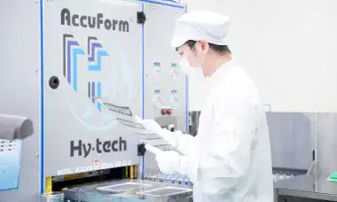 午後の製造開始する前にもう一度装置を点検。異常がないことを確認して製造を再開します。午前中の結果をもとに意見を出し合い、製造条件を変更しながら製品サンプルを製造します。