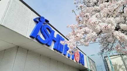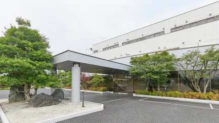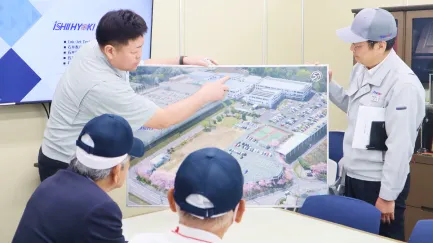 「ISHIIHYOKI」のロゴがある守衛室の前を進むと正面玄関があります。