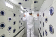 クリーンルームへの異物を持ち込まないように、入室前にエアーシャワーでホコリや微粒子を強力な空気で吹き飛ばします。
